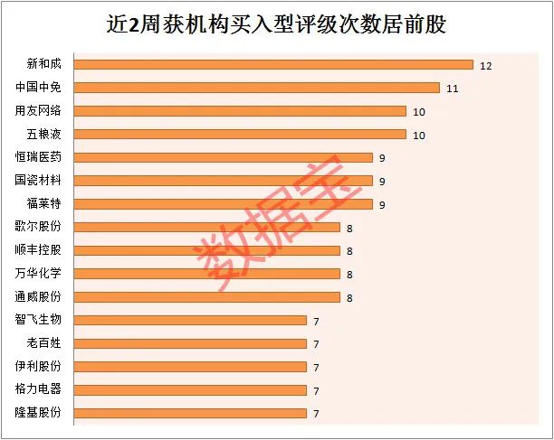 证券时报·数据宝统计显示,近两周(6月19日至7月2日)机构共对621只股票给予买入型评级包括买入、强烈推荐、推荐、增持。35只股票获机构买入型评级次数超过5次,其中新和成、中国中免、五粮液、用友网络等股获买入型评级次数居前。