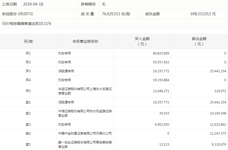 软控股份今天涨停。盘后数据显示,4个机构出现在龙虎榜单上,合计净买入1.57亿元;华宝证券股份有限公司上海东大名路证券营业部买入1364.93万元,同时卖出12万元;中信证券股份有限公司杭州凤起路证券营业部买入3.5万元,同时卖出1410.43万元。