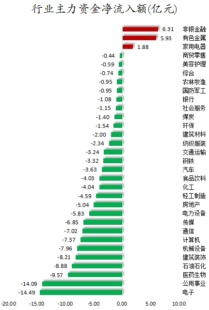 从行业来看,申万所属的31个一级行业,今日仅有非银金融、有色金属、家用电器3个行业主力资金呈现净流入,净流入金额分别为6.31亿元、5.93亿元、1.88亿元。28个行业主力资金呈现净流出,其中,电子行业主力资金净流出最多,净流出金额为14.49亿元;行业主力资金净流出靠前的还有公用事业、医药生物、石油石化、建筑装饰、机械设备,净流出金额分别为14.09亿元、9.57亿元、8.88亿元、8.21亿元、7.96亿元。
