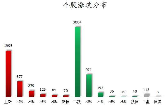 截至收盘,沪深两市合计1995只个股上涨,3004只个股下跌,平盘个股113只,停牌的个股3只。不含当日上市新股,共有70只个股涨停,40只个股跌停。连续涨停天数看,同为股份、春光科技均已连收5个涨停板,连续涨停板数量最多。