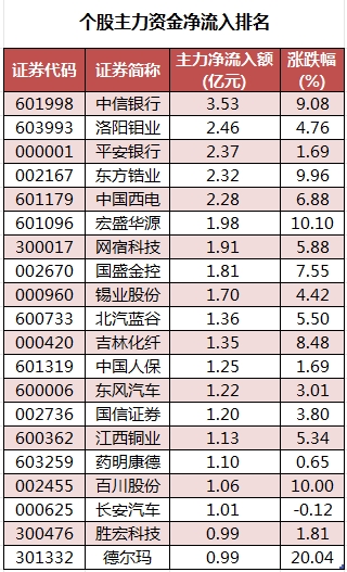 个股来看,今日有2146只个股获主力资金净流入,其中,18股获主力资金净流入超1亿元。中信银行主力资金净流入最多,净流入金额为3.53亿元;主力资金净流入居前的个股还有洛阳钼业、平安银行、东方锆业、中国西电、宏盛华源,净流入金额分别为2.46亿元、2.37亿元、2.32亿元、2.28亿元、1.98亿元。