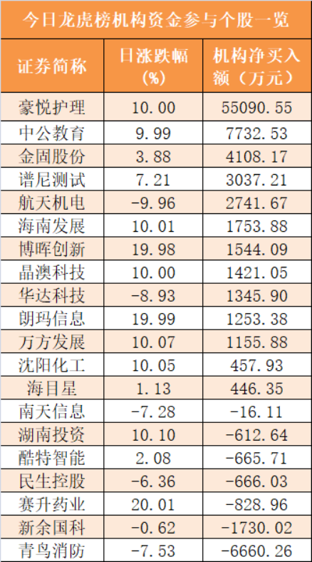 盘后龙虎榜数据显示,机构现身20股,其中豪悦护理等13股呈现机构资金净买入,青岛消防等7股呈现机构资金净卖出。