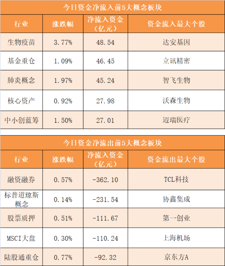 概念板块方面,今日生物疫苗、基金重仓、肺炎概念、核心资产等概念板块资金呈现净流入,其中生物疫苗概念净流入48.54亿元居首。