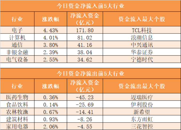 28个申万一级行业中,22个行业实现资金净流入,其中电子行业净流入171.8亿元居首。