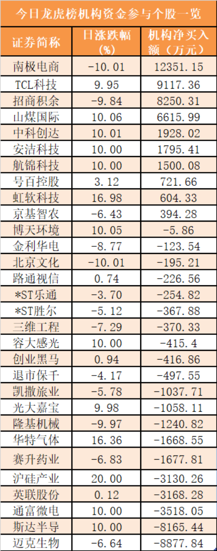 盘后龙虎榜数据显示,机构现身30股,其中南极电商等10只股票呈现机构资金净买入,迈克生物等20股呈现机构资金净卖出。