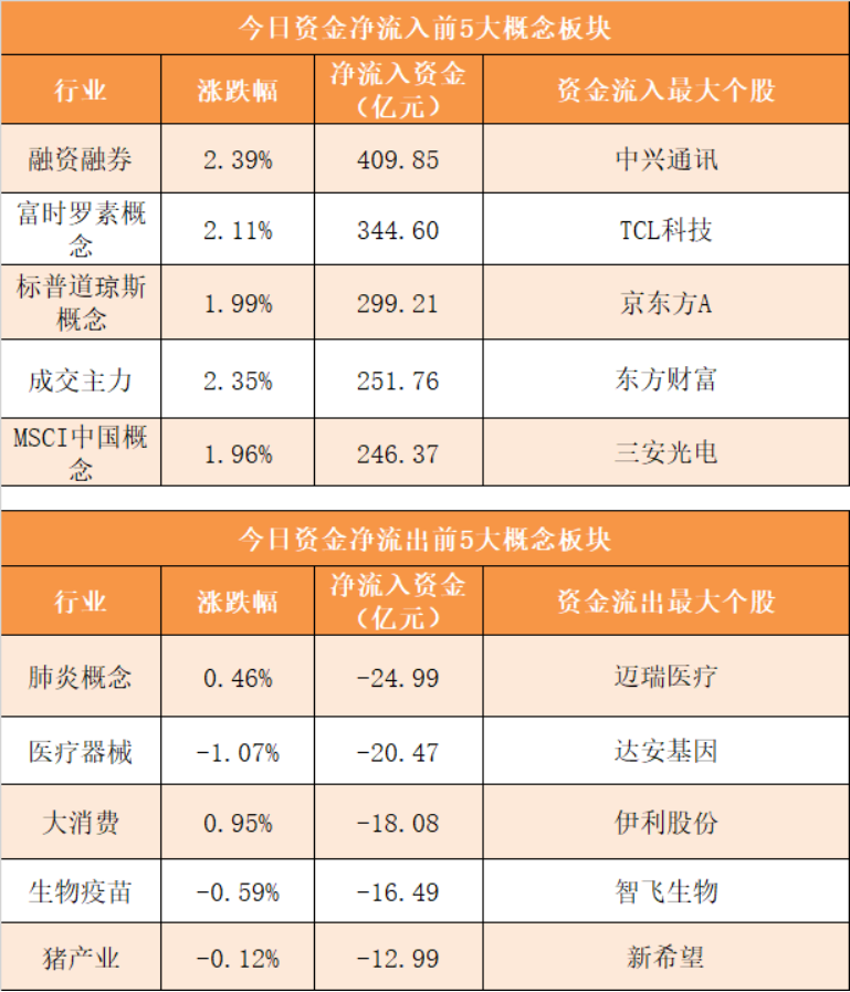 概念板块方面,今日融资融券、富时罗素概念、标普道琼斯概念、成交主力等概念板块资金呈现净流入,其中融资融券概念净流入409.85亿元居首。