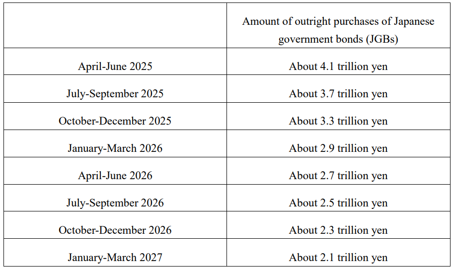日本央行放缓了其每月债券购买规模的缩减速度,从2026年4月起,将月度减持规模从目前的每季度4000亿日元降至每季度2000亿日元;预计2027年1月至3月的购买总额将约为2万亿日元。分析指出,这大致相当于该行在2013年实行超宽松货币政策之前的购债水平。