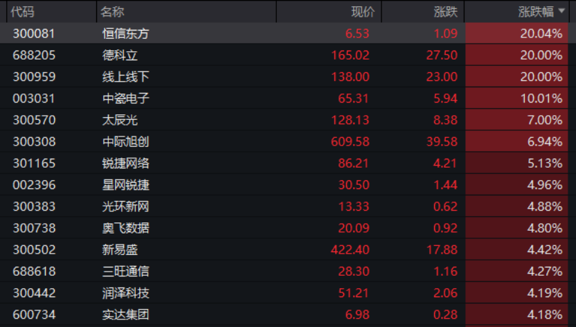 行业板块和赛道来看,若按照申万一级行业划分,通信板块大涨,板块盘中涨幅超过3%,恒信东方、德科立、线上线下等“20cm”涨停,另有中际旭创、新易盛等多股跟涨。