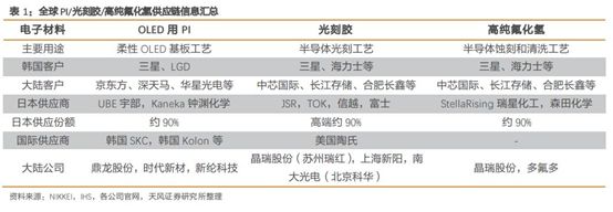天风证券预计,大陆 OLED和半导体战略物资将加速进口替代 ,下游各 OLED 和 半导体制造商会长期逐步降低对单一供应商或者单一地区供应商的依赖,同时,加快 扶持本土产业集群是降低供应链安全的重要趋势,预计韩国会逐步加快培 养本土 PI/光刻胶/高纯氟化氢等产品供应商,同时大陆 OLED 和半导体用战略物资将加速进口替代。