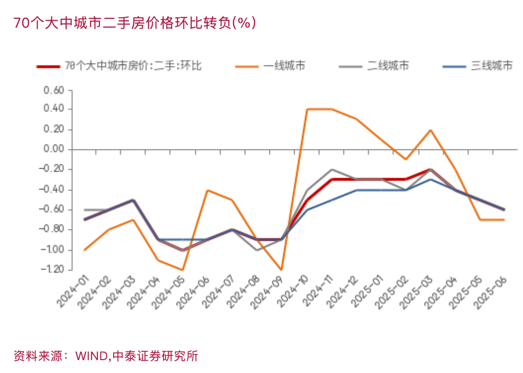 四是在人口老龄化加速、城镇化进程放缓的背景下,房地产受长周期下行的压制,乍暖还寒。二季度房地产出现边际转弱迹象。上半年,新建商品房销售面积和销售额同比分别下降3.5%和5.5%,比去年四季度和今年一季度的“止跌回稳”势头有所减弱。房地产销售价格重回下行区间,特别是二季度以来一线城市二手房销售价格再度出现环比下降。