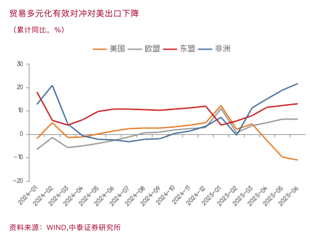 外贸出口超预期则有应对关税不确定性的经营主体自发“抢出口”“抢转口”。出口多元化有效对冲对美出口下降,上半年,以美元计价的货物出口金额同比增长5.9%;其中,我国对非洲、东盟、欧盟出口分别增长21.6%、13%、6.6%,对美出口下降10.9%。