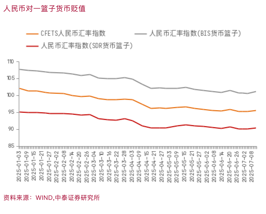 7月份以来,由于美元指数止跌回升,离岸、在岸人民币出现边际走贬。7月4日,CFETS人民币汇率指数跌至95.3,创2020年12月以来新低,较去年末贬值6.1%。
