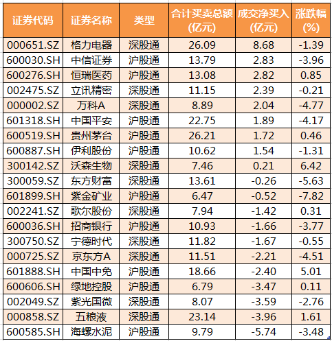 个股方面,格力电器中信证券恒瑞医药立讯精密万科A北向资金净买入金额居前,净买入金额分别为8.68亿元、2.83亿元、2.82亿元、2.39亿元、2.04亿元;海螺水泥五粮液紫光国微、绿地控股、中国中免北向资金净卖出较多,净卖出金额分别为5.74亿元、3.96亿元、3.59亿元、3.47亿元、2.4亿元。
