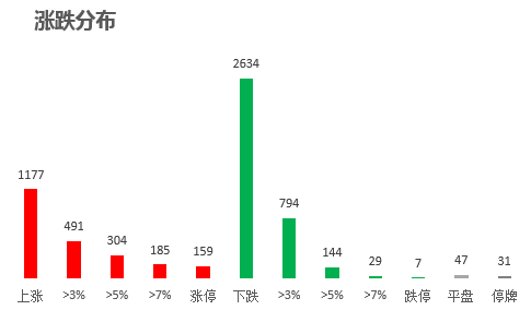 截至收盘,沪深两市合计1177只个股上涨,2634只个股下跌。包括ST股在内,共有159只个股涨停,7只个股跌停。