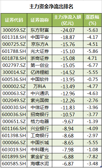 此外,263股被主力资金净卖出超亿元。其中,东方财富中国平安京东方A光大证券浙商证券主力资金净流出较多,净流出金额分别为24.07亿元、18.87亿元、15.76亿元、15.10亿元、15.08亿元。