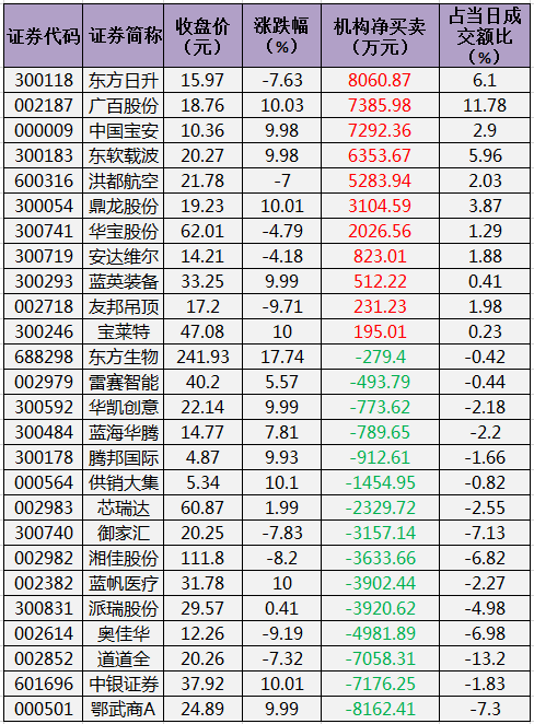盘后龙虎榜数据显示,机构席位资金净卖出7757.02万元,其中,净买入的个股11只,净卖出的个股15只。机构净买入最多的股票是东方日升,净买入金额为8060.87万元;机构净卖出最多的股票是鄂武商A,净卖出金额为8162.41万元。