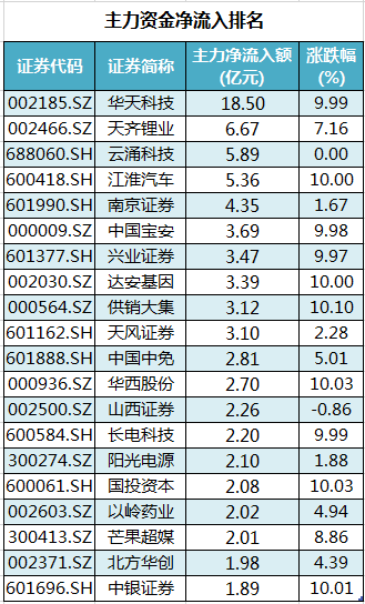 具体到个股来看,62股主力资金净流入超亿元。其中,华天科技天齐锂业、云涌科技、江淮汽车南京证券主力资金净流入居前,净流入金额分别为18.5亿元、6.67亿元、5.89亿元、5.36亿元、4.35亿元。