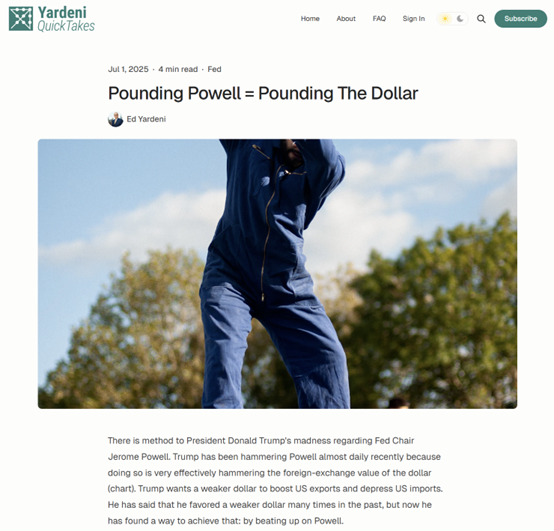 “他(特朗普)过去曾多次表示,他支持美元走弱,现在他找到了实现这一目标的方法:痛批鲍威尔。” 亚德尼写道。