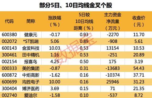 截至最新收盘,有13只A股的5日均线主动上穿10日均线,其中健康元、*ST凯瑞、金发科技等个股的5日均线较10日均线距离最大,分别达0.93%、0.89%、0.53%。