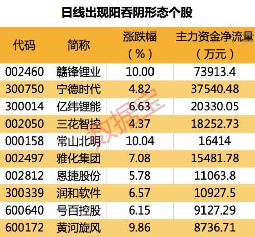 最新数据显示,两市共有62只个股日K线出现阳吞阴形态,当天涨幅最大的是康盛股份、常山北明、未名医药,涨幅分别为10.11%、10.04%、10.04%。