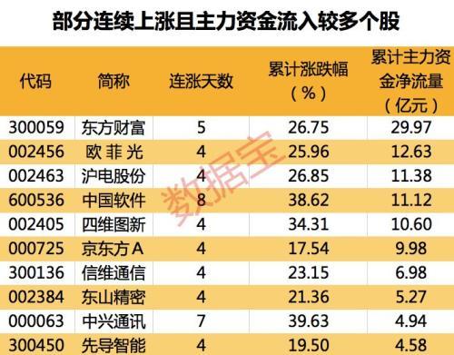 值得注意的是,596只连续上涨个股中,82只个股期间主力资金累计净流入超过亿元。其中,累计资金流入最多的为东方财富,主力资金累计流入29.97亿元。