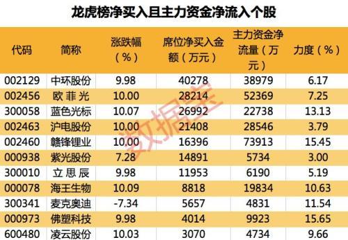 速看!龙虎榜净买入且主力资金净流入个股一览