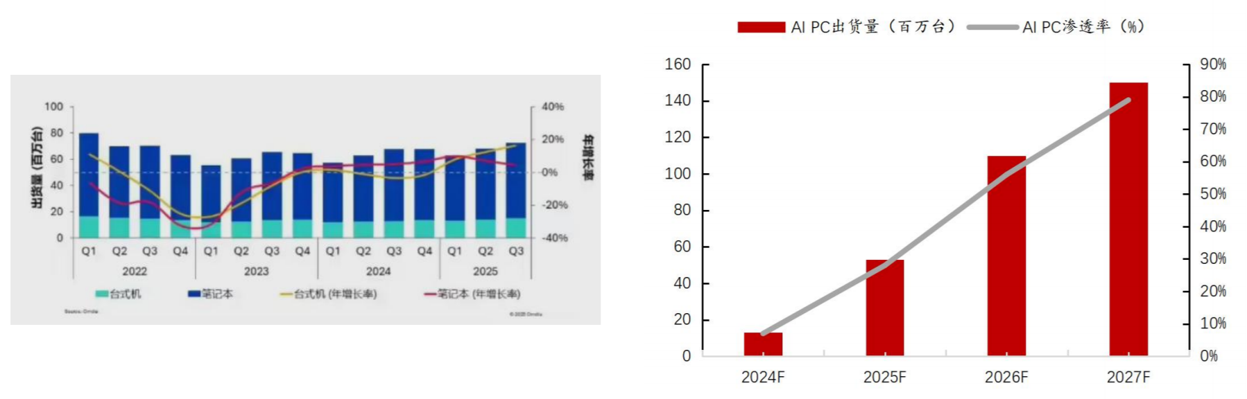 图:22Q1-25Q3全球台式机和笔记本出货量(左图),27年AIPC将成为主流商品(右图) |