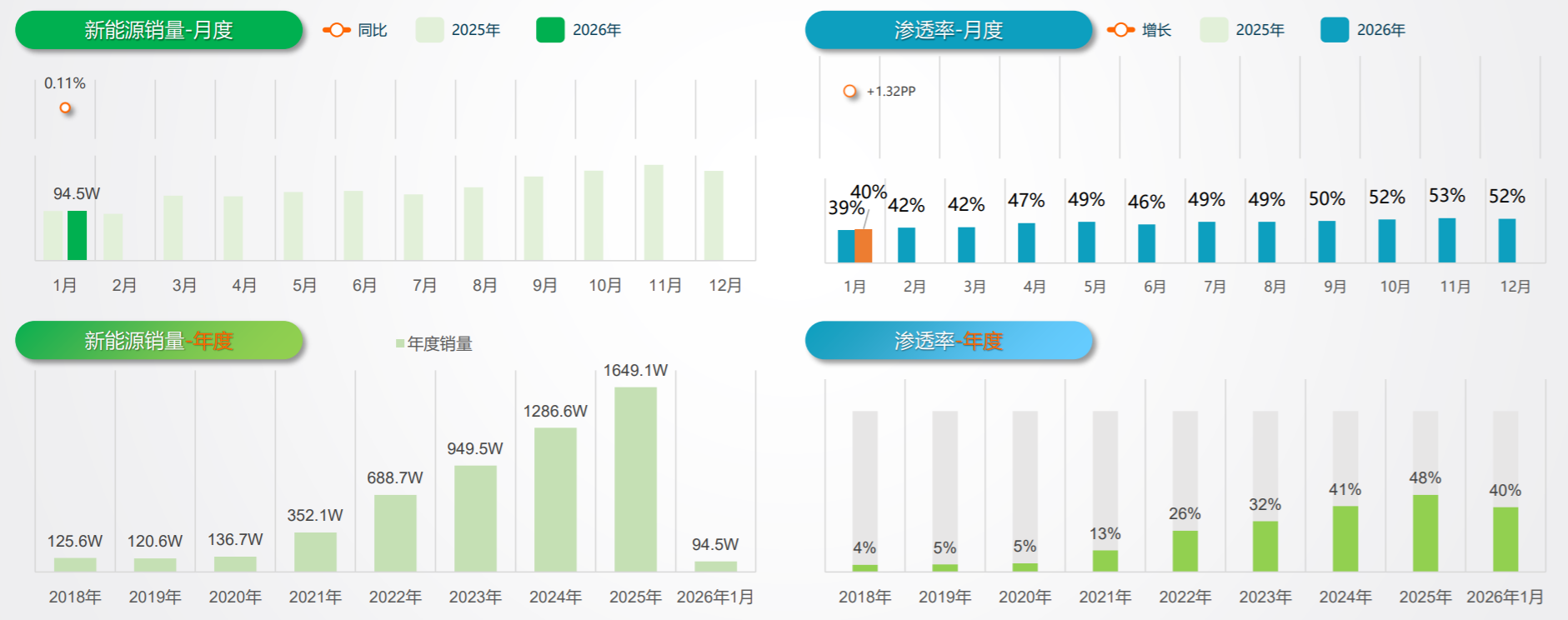 新能源车方面,2026年1月,根据中汽协数据,中国新能源汽车市场呈现高位运行态势:单月销量达94.5万辆,同比微增0.11%;市场渗透率为52%,较2025年同期提升1.32个百分点,继续保持在超五成的高位。从年度维度看,2025年全年新能源销量达1649.1万辆,渗透率为48%,为2026年市场奠定了坚实基础。