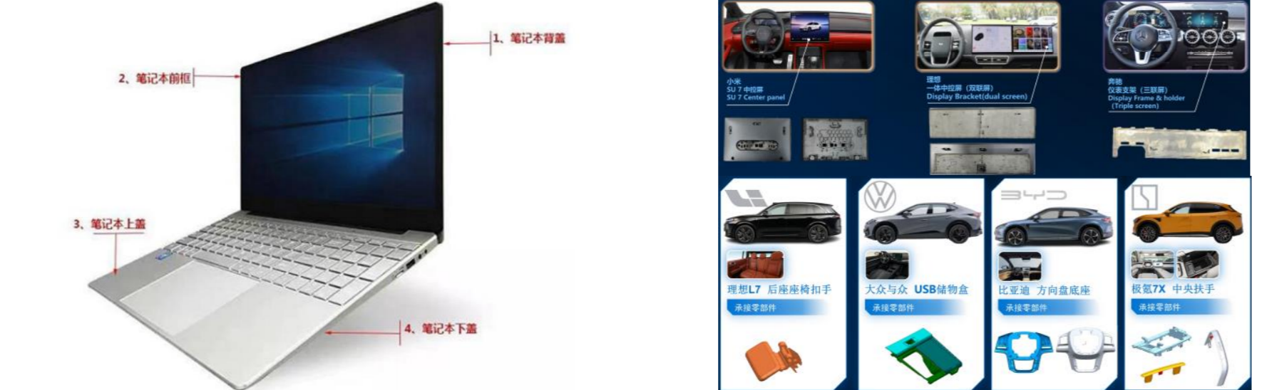 客户结构看,笔电结构件领域与联想、戴尔、三星、惠普等全球笔电龙头、华勤等领先代工厂建立稳定合作关系。在新能源汽车结构件方面,已进入小米、蔚来、小鹏、比亚迪、宝马、吉利、大众等车企供应链体系,不断提升市场份额维持高增长态势。