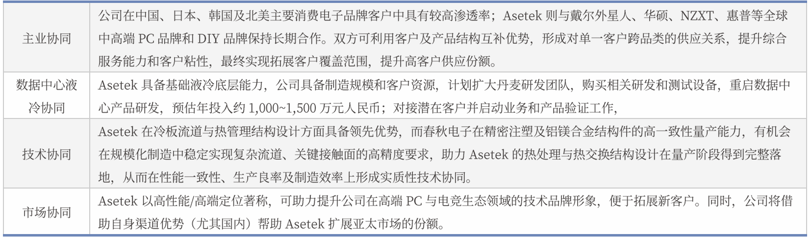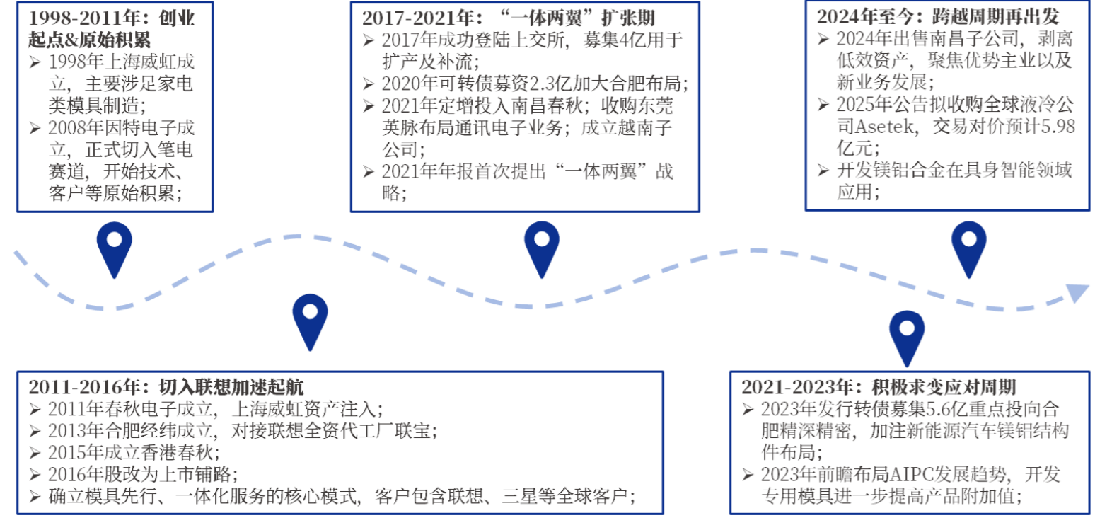 十年深耕造就笔电龙头。春秋电子前身是成立于1998年的上海威虹,创始人薛革文凭借多年的行业经验积累,正式创业并从事家电模具业务。2008年预判未来消费电子浪潮成立因特电子正式切入笔电机构件赛道。2011年春秋电子正式成立,后续创立上海威泓、合肥经纬等核心子公司,并深刻绑定联想全资代工厂联宝,规模开始快速提升。2017年春秋电子于上交所上市,确立通过自主设计制造高精度模具,实现对结构件产品质量和成本的有效控制,为客户提供从设计到生产的一站式服务模式。2020年起公司开始布局新业务方向,构建了“一体两翼”战略方针:截至2024年,公司在笔电结构市场已形成领先优势,营收规模居行业前列,同时国内新能源汽车结构件与通信电子已初具雏形。2025年11月公司公告拟收购全球液冷龙头Asetek,正式布局液冷赛道。