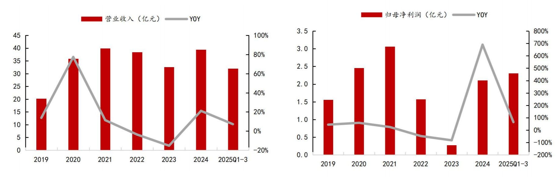图:公司2019-2025前三季度营收(左),公司2019-2025前三季度归母净利润(右) |