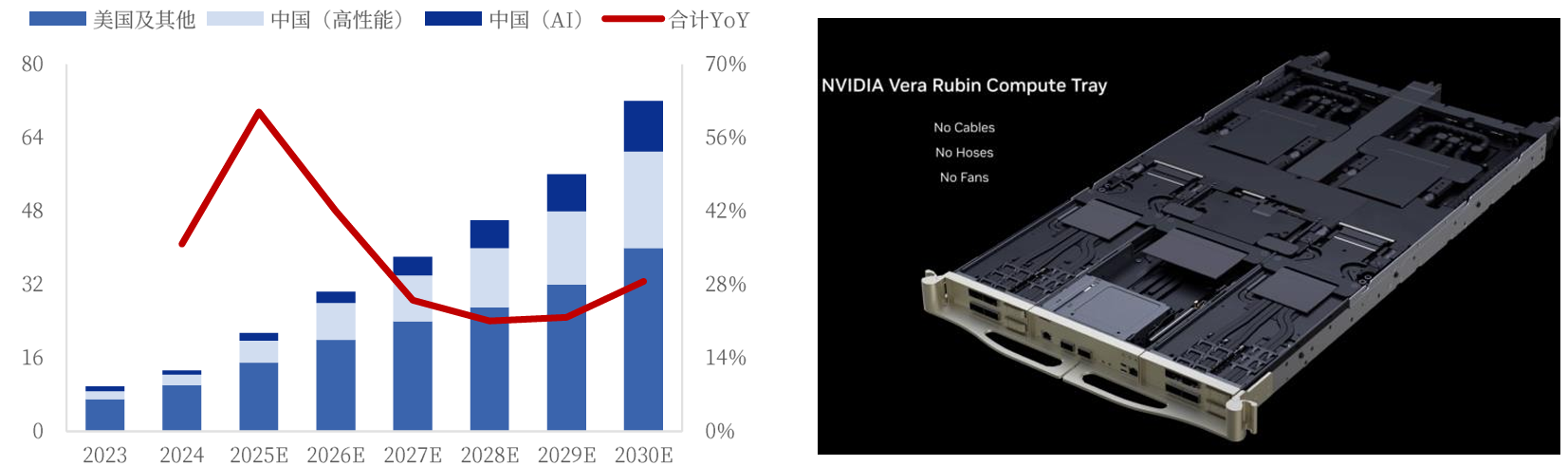 图:2023-2030年全球AI服务器出货量(机架单位:万台,左),2026CES英伟达展示RubinNVL72(右) |