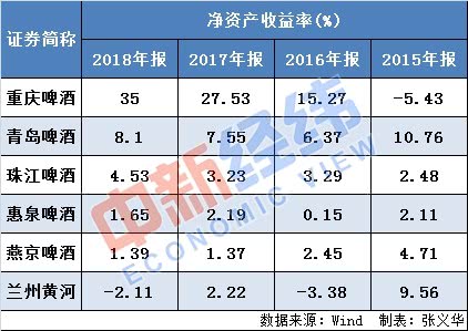 从近四年披露的上市公司年报数据可以看出,啤酒的净资产收益率相对于白酒来说,增长并没有那么持续和强劲。除重庆啤酒、青岛啤酒外,大部分个股低于5%以下,处于较低增长。