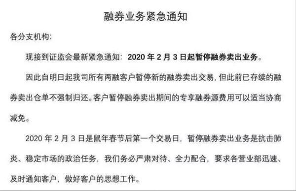 此外,据媒体报道,证监会2月2日晚间对多家券商下发通知,要求2020年2月3日起暂停融券卖出业务。
