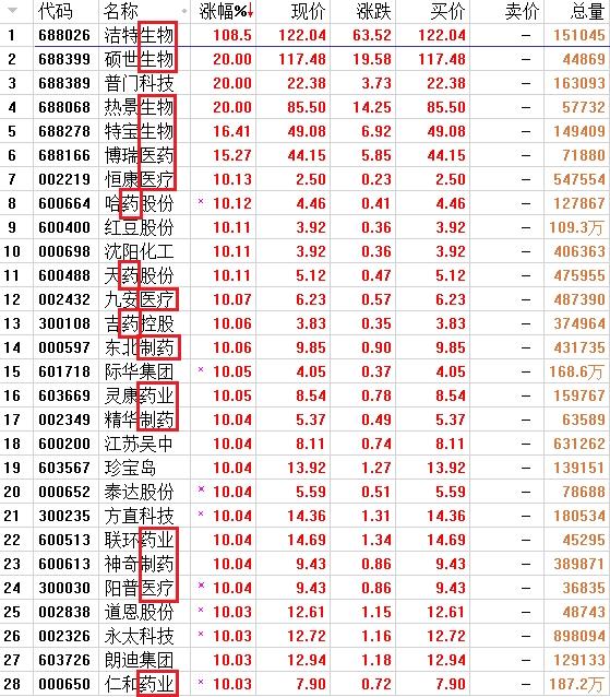 虽然A股受到疫情影响出现大跌,但医药概念股却逆势大涨。今日涨幅排名靠前的个股中,生物、医药、医疗概念股占据了半壁江山。涨幅前28名的个股中,光股票名称中带有“生物”、“制药”、“医疗”等字样的就占到了17个。