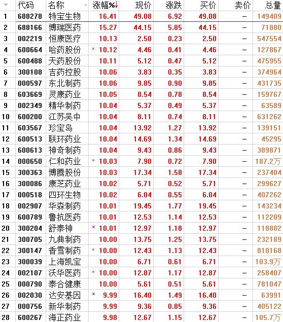 而在医药板块中,共有哈药股份、东北制药、精华制药、江苏吴中等36只个股涨停。