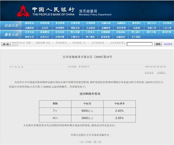 除了上文提到的央行释放1.2万亿元流动性之外,2月1日下午,央行等五部委联合发布《关于进一步强化金融支持防控新型冠状病毒感染肺炎疫情的通知》,要求保持流动性合理充裕,并表示,在2月3日金融市场开市后,将加大逆周期调节强度,保持金融市场流动性合理充裕。