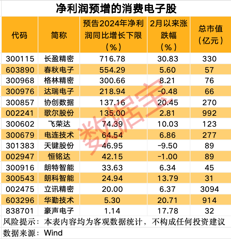 据证券时报·数据宝统计,A股中消费电子产业链个股共有95只,2月以来普遍上涨,平均涨幅达到12.2%,显著跑赢大盘,其中15股累计涨幅在20%以上,福立旺、致尚科技、慧为智能3股涨幅超40%。