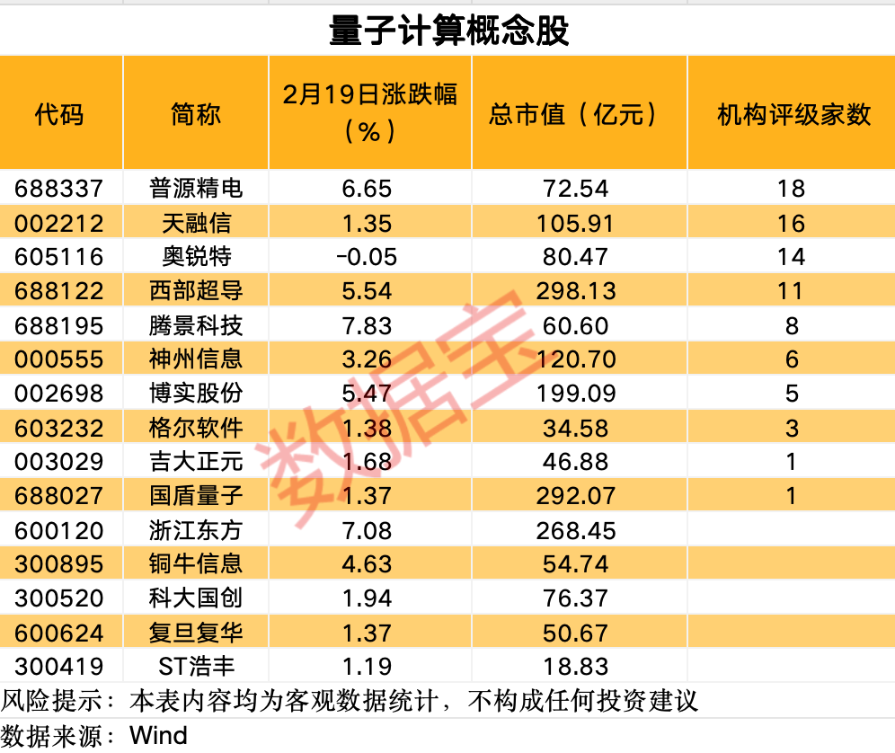 A股市场中,布局量子计算的概念股共有15只,2月19日普遍上涨,腾景科技、浙江东方、普源精电涨幅居前,分别为7.83%、7.08%、6.65%。概念股中,普源精电、天融信、奥锐特最受机构关注,评级机构家数分别为18家、16家、14家。