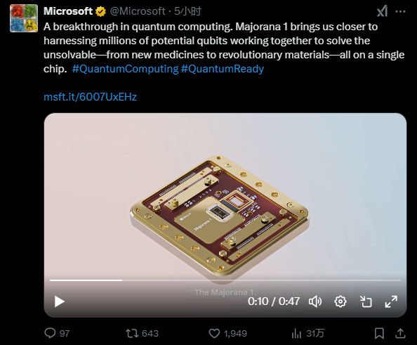 昨日晚间,微软官网发布量子计算芯片Majorana 1。据介绍,Majorana 1是全球首款采用新型拓扑核心架构的量子芯片,微软预计,该技术将使量子计算机在数年而非数十年内实现解决具有实际意义的工业级问题的能力,涵盖从新药研发到战略性新材料设计等广泛领域。