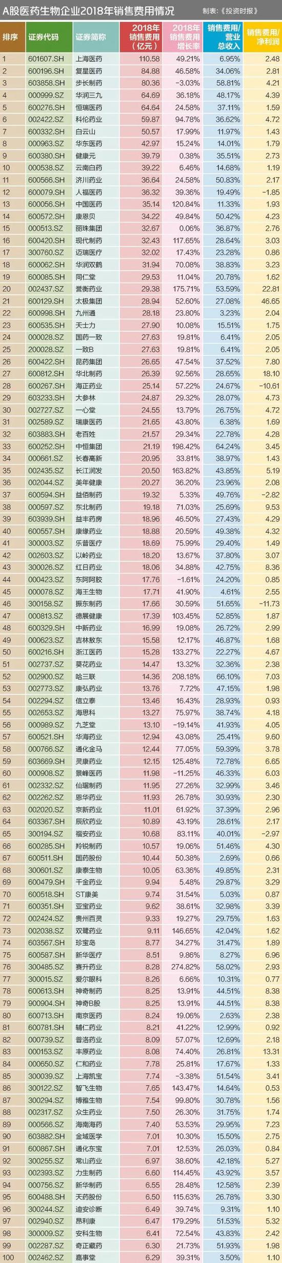 《投资时报》记者注意到,A股上市药企2018年销售费用超过60亿元的公司共有五家,分别为上海医药、复星医药、步长制药、华润三九和恒瑞医药,他们也依次占据了前五名的位次,合计销售费用高达405.15亿元。巧合的是,这五家公司均在抽查名单中。