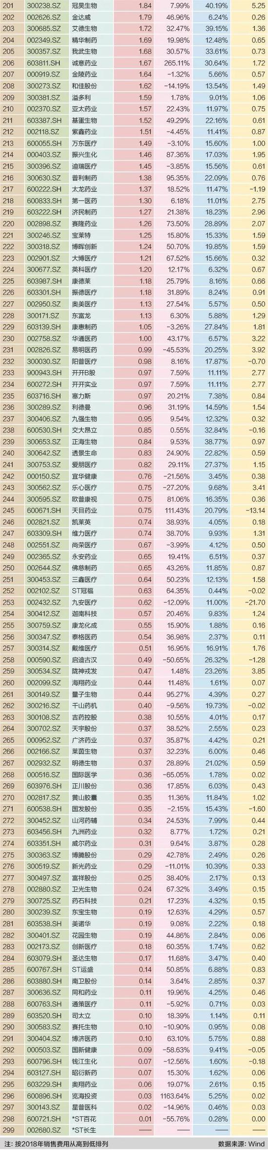 总净利润角度来看,尽管被认为是相当“有得赚”的行业,但生物医药行业依然有25家公司2018年净利润为负,而有119家公司要付出超过2元以上的销售费用才能换得1元净利润。最高者如仟源医药(300254.SZ),竟然需要付出63.93元销售费用才能得到1元净利润,其截至6月10日不过15.44亿元的市值或许并非来自投资者的“误判”。
