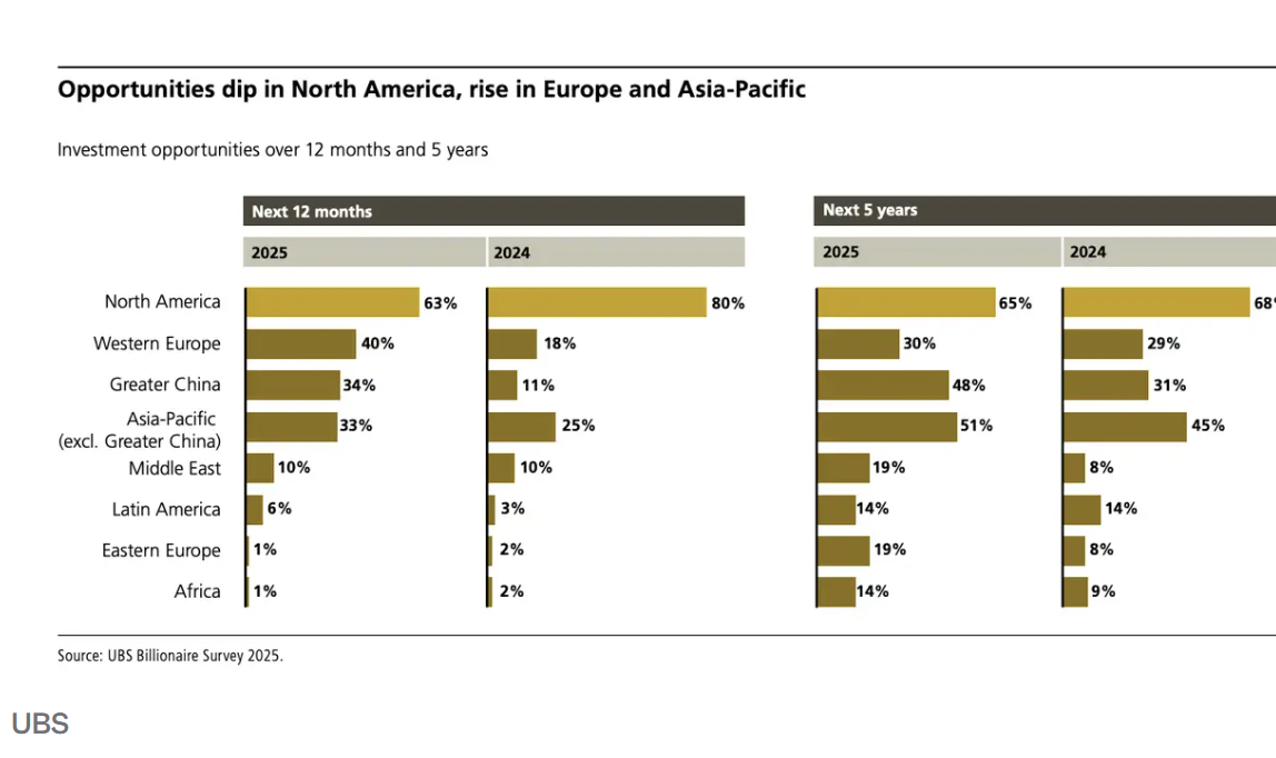 与之相对的是,亿万富豪们对北美市场的乐观情绪大幅降温。在2024 年的调查中,80%的受访者青睐北美市场,而2025年这一比例骤降至63%。