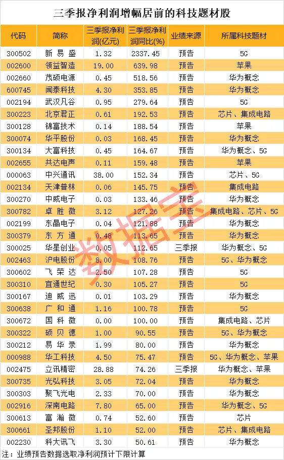 数据宝统计显示,5G、华为、芯片、苹果、集成电路五大科技题材股中,按照三季报及预告净利润下限计算,23股净利润有望翻倍增长。