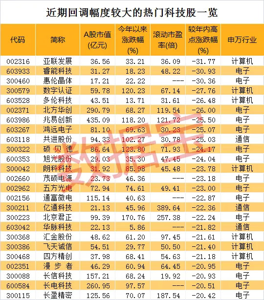 证券时报·数据宝统计显示,科技类题材扎堆的电子、计算机、通信行业板块中,不含近一个月上市的次新股,在近一个月创下年内高点且较年内高点回调幅度超过10%的个股,共计65只,其中25股累计回调20%以上。