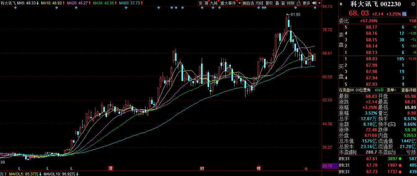 7月11日,科大讯飞拉升,截至发稿,股价报68.03元,涨3.25%。