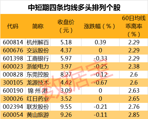 截至最新,592只个股5日、10日、20日、60日四条均线近日呈多头排列。其中杭州解百、交运股份、工商银行股价与60日均线的乖离率最小,分别为2.29%、2.29%、2.29%。