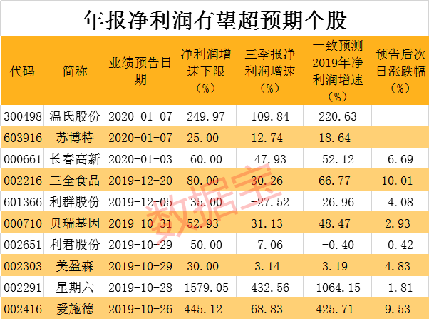 在已披露了年报业绩预告的个股中,业绩预喜股占比过半。数据宝统计,除去科创板个股和近期上市的次新股,10家公司年报预告净利润增速同时超过三季报净利润增速和分析师一致预测的净利润增速,全年业绩有望超预期。相关个股业绩预告发布后首日股价均上涨,平均涨幅5.04%。