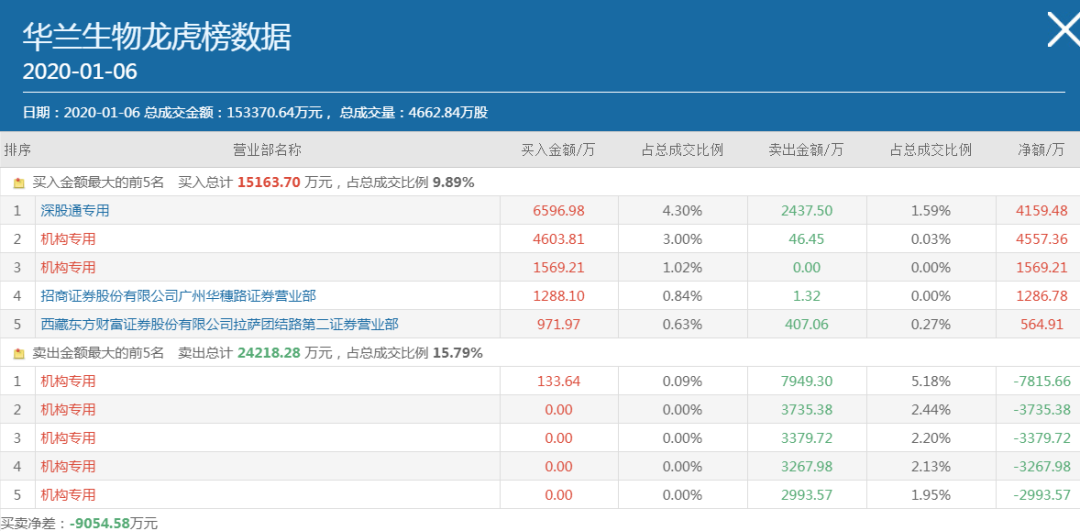 1月6日龙虎榜中,机构及营业部席位资金净买入1.62亿元,其中净买入的个股有23只;净卖出的个股有16只。净买入前三名个股分别是中国宝安、云南锗业、新文化等,净买入金额占当日成交额比例达22.86%、12.36%、18.55%。