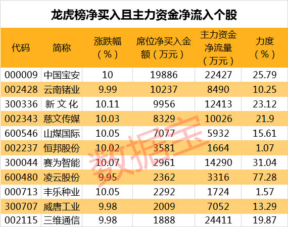 从盘口资金流向来看,主力资金净流入超五千万且龙虎榜净买入个股共有10只,其中三维通信、中国宝安、赛为智能等个股资金净流入金额最大。净流入力度最大的个股有凌云股份、赛为智能、中国宝安,净流入力度分别为77.28%、31.04%、25.79%。